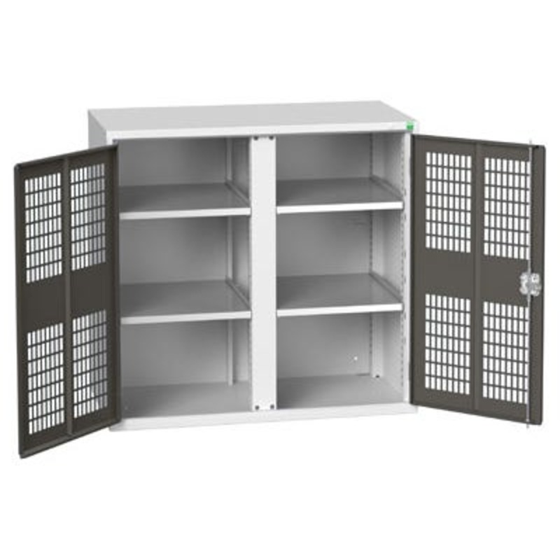 verso ventilated door kitted cupboard with vertical partition. Featuring a robust, fully welded steel housing with a central vertical partition and double, Ventilated doors with 4 adjustable height, galvanised steel shelves (75kg U.D.L.). Finished in durable powder coat paint in RAL 7035 light grey / RAL 7016 anthracite grey. WxDxH: 1050x550x1000mm.