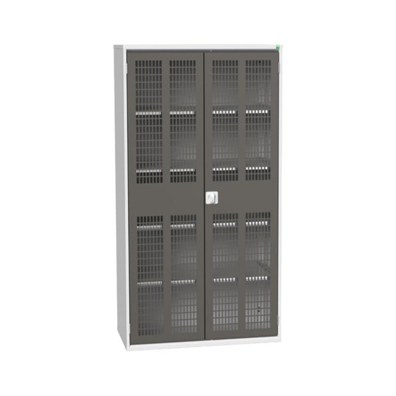 verso shelf cupboard. Featuring a robust, fully welded steel housing with double, ventilated, doors with 4 adjustable height, galvanised steel shelves (75kg U.D.L.). Finished in durable powder coat paint in RAL 7035 light grey / RAL 7016 anthracite grey. W