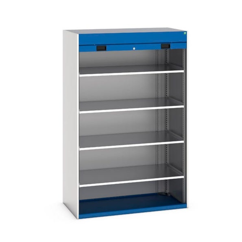 cubio shelf cupboard. Featuring a heavy duty, reinforced steel housing with up to 1.5 tonne total capacity with single, roller shutter door with 4 adjustable height, galvanised steel shelves (160kg U.D.L.). Finished in durable powder coat paint in RAL 7035 light grey / RAL 5010 gentian blue. WxDxH: 1300x650x2000mm.