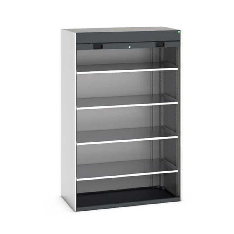 cubio shelf cupboard. Featuring a heavy duty, reinforced steel housing with up to 1.5 tonne total capacity with single, roller shutter door with 4 adjustable height, galvanised steel shelves (160kg U.D.L.). Finished in durable powder coat paint in RAL 7035 light grey / RAL 7016 anthracite grey. WxDxH: 1300x650x2000mm.