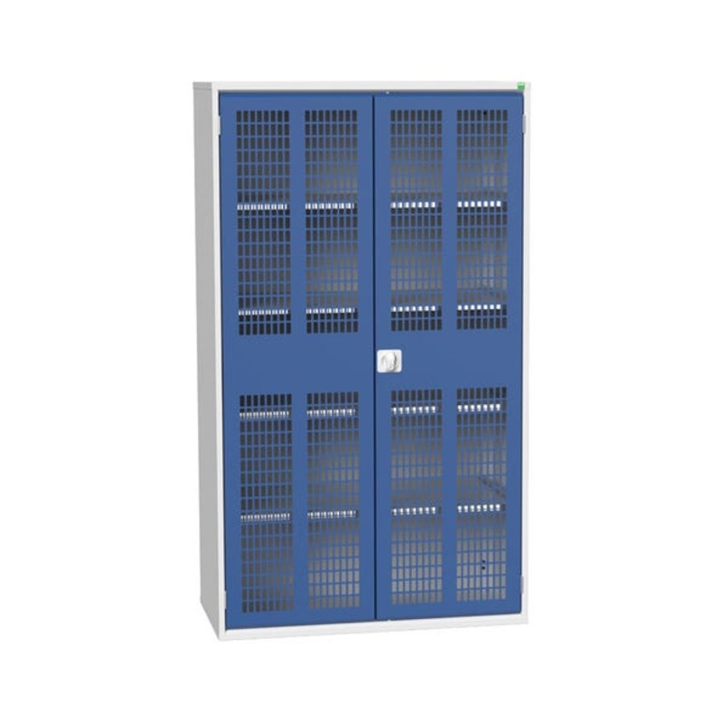 verso shelf cupboard. Featuring a robust, fully welded steel housing with double, ventilated, doors with 4 adjustable height, galvanised steel shelves (75kg U.D.L.). Finished in durable powder coat paint in RAL 7035 light grey / RAL 5010 gentian blue. WxDxH: 1300x550x2000mm.