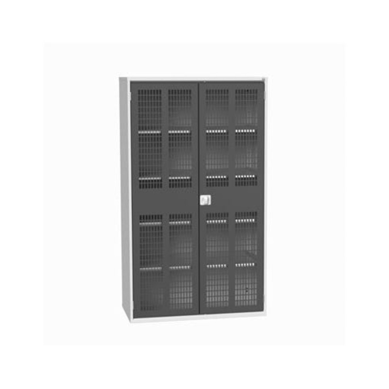 verso shelf cupboard. Featuring a robust, fully welded steel housing with double, ventilated, doors with 4 adjustable height, galvanised steel shelves (75kg U.D.L.). Finished in durable powder coat paint in RAL 7035 light grey / RAL 7016 anthracite grey. W