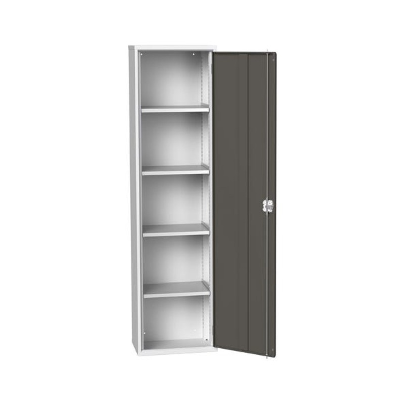 verso shelf cupboard. Featuring a robust, fully welded steel housing with single, reinforced door with 4 adjustable height, galvanised steel shelves (75kg U.D.L.). Finished in durable powder coat paint in RAL 7035 light grey / RAL 7016 anthracite grey. WxDxH: 525x350x2000mm.