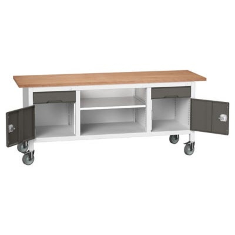 Verso mobile storage bench 2000mm x 600mm x 830mm with mpx worktop Brand:Bott Manufacturer Part Number:16923231 Colour:Light Grey / Anthracite Grey Height (mm):830 Depth (mm):600 Width (mm):2000