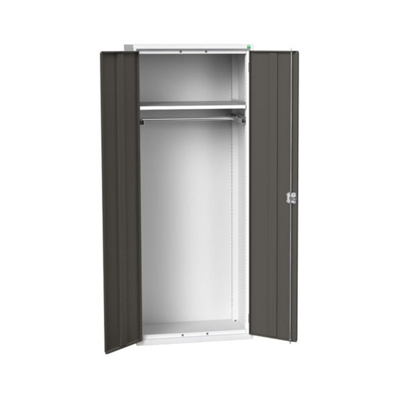 verso PPE / janitorial kitted cupboard. Featuring a robust, fully welded steel housing and double, reinforced doors with 1 adjustable height, galvanised steel shelf (75kg U.D.L.) and a hanging rail. Finished in durable powder coat paint in RAL 7035 light grey / RAL 7016 anthracite grey. WxDxH: 800x550x2000mm.