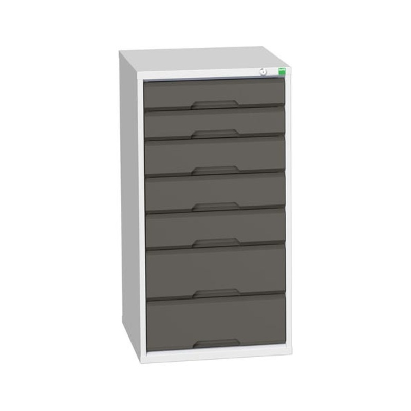 verso drawer cabinet with 7 drawers. Featuring a robust, fully welded steel housing with 100% extension drawers. Drawer configuration: 2x 100mm, 3x 125mm, 2x 175mm (75kg U.D.L.). Finished in durable powder coat paint in RAL 7035 light grey / RAL 7016 anthracite grey. WxDxH: 525x550x1000mm.