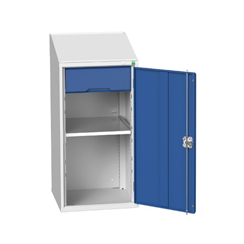 verso lectern cupboard. Featuring a robust, fully welded steel housing with sloping top writing top a lockable cupboard and single, reinforced door with 1 adjustable height, galvanised steel shelf (75kg U.D.L.) and 1x 175mm drawer with 100% extension slides (75kg U.D.L.). Finished in durable powder coat paint in RAL 7035 light grey / RAL 5010 gentian blue. WxDxH: 525x550x1130mm.