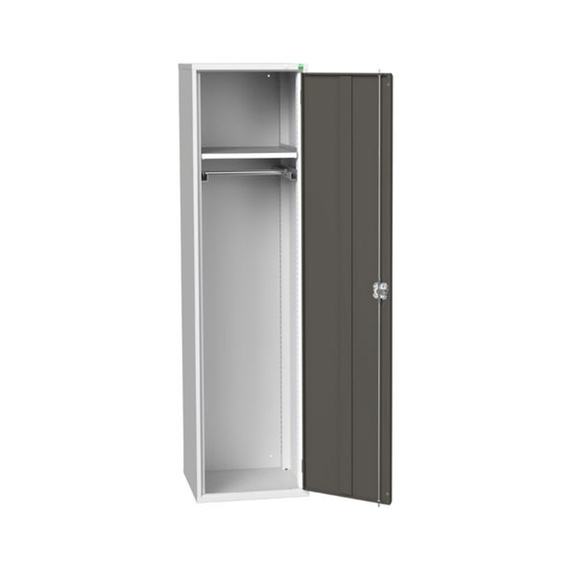 verso PPE / janitorial kitted cupboard. Featuring a robust, fully welded steel housing and single, reinforced door with 1 adjustable height, galvanised steel shelf (75kg U.D.L.) and a hanging rail. Finished in durable powder coat paint in RAL 7035 light grey / RAL 7016 anthracite grey. WxDxH: 525x550x2000mm.