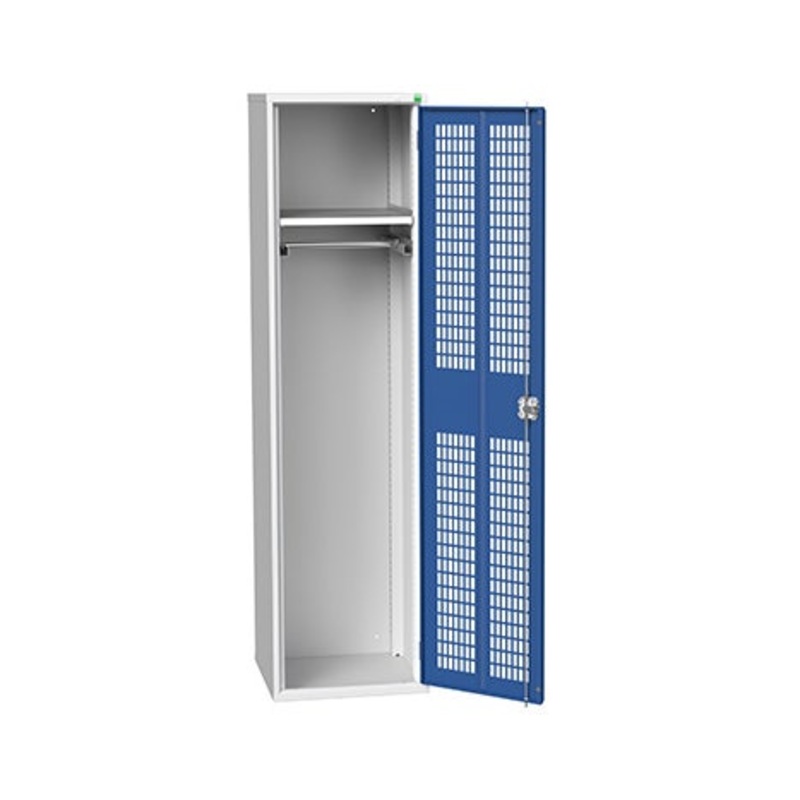 verso ventilated door PPE / janitorial kitted cupboard. Featuring a robust, fully welded steel housing and single, Ventilated door with 1 adjustable height, galvanised steel shelf (75kg U.D.L.) and a hanging rail. Finished in durable powder coat paint in RAL 7035 light grey / RAL 5010 gentian blue. WxDxH: 525x550x2000mm.