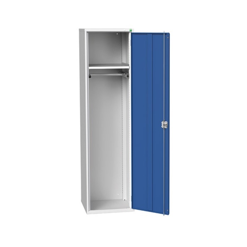 verso PPE / janitorial kitted cupboard. Featuring a robust, fully welded steel housing and single, reinforced door with 1 adjustable height, galvanised steel shelf (75kg U.D.L.) and a hanging rail. Finished in durable powder coat paint in RAL 7035 light grey / RAL 5010 gentian blue. WxDxH: 525x550x2000mm.
