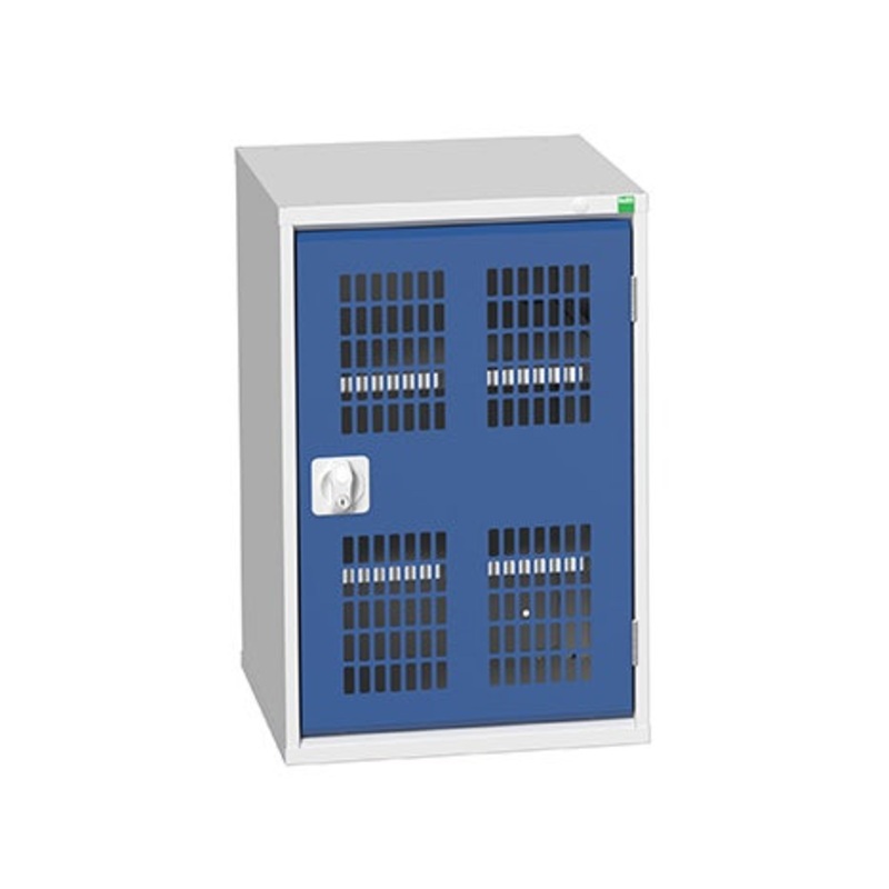 verso shelf cupboard. Featuring a robust, fully welded steel housing with single, ventilated door with 2 adjustable height, galvanised steel shelves (75kg U.D.L.). Finished in durable powder coat paint in RAL 7035 light grey / RAL 5010 gentian blue. WxDxH: 525x550x800mm.
