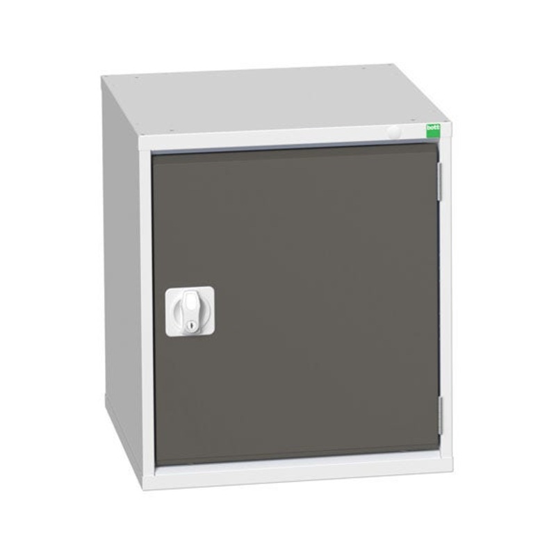 verso shelf cupboard. Featuring a robust, fully welded steel housing with single, reinforced door with 1 adjustable height, galvanised steel shelf (75kg U.D.L.). Finished in durable powder coat paint in RAL 7035 light grey / RAL 7016 anthracite grey. WxDxH: 525x550x600mm.