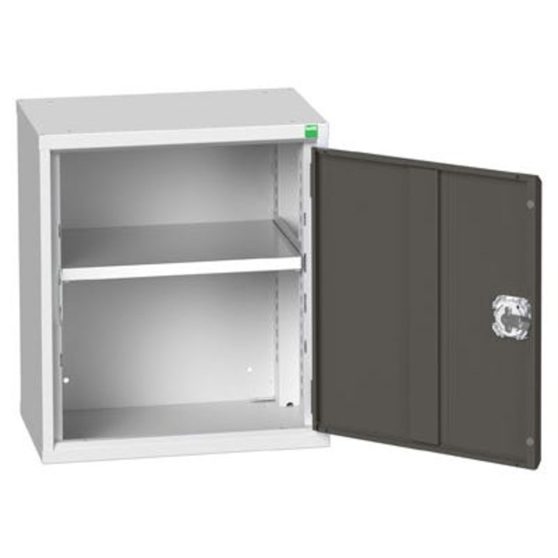 verso wall / shelf cupboard. Featuring a robust, fully welded steel housing with single, reinforced door with 1 adjustable height, galvanised steel shelf (75kg U.D.L.). Finished in durable powder coat paint in RAL 7035 light grey / RAL 7016 anthracite grey. WxDxH: 525x350x600mm.