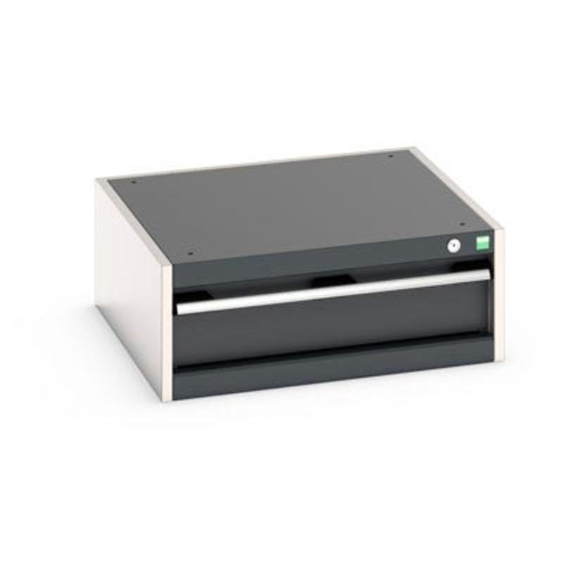 cubio drawer cabinet with 1 drawer. Featuring a heavy duty, reinforced steel housing with up to 1.5 tonne total capacity and 100% extension drawers. Drawer configuration: 1x 150mm (75kg U.D.L.). Finished in durable powder coat paint in RAL 7035 light grey / RAL 7016 anthracite grey. WxDxH: 650x650x250mm.