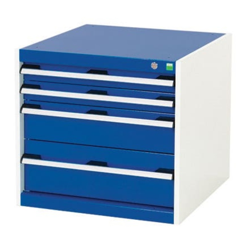 cubio drawer cabinet with 4 drawers. Featuring a heavy duty, reinforced steel housing with up to 1.5 tonne total capacity and 100% extension drawers. Drawer configuration: 2x 75mm, 1x 150mm, 1x 200mm (75kg U.D.L.). Finished in durable powder coat paint in RAL 7035 light grey / RAL 5010 gentian blue. WxDxH: 650x650x600mm.