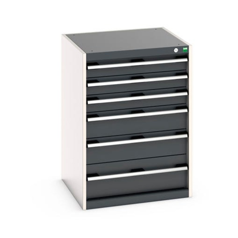 cubio drawer cabinet with 6 drawers. Featuring a heavy duty, reinforced steel housing with up to 1.5 tonne total capacity and 100% extension drawers. Drawer configuration: 3x 100mm, 2x 150mm 1x 200mm (75kg U.D.L.). Finished in durable powder coat paint in RAL 7035 light grey / RAL 7016 anthracite grey. WxDxH: 650x650x900mm.