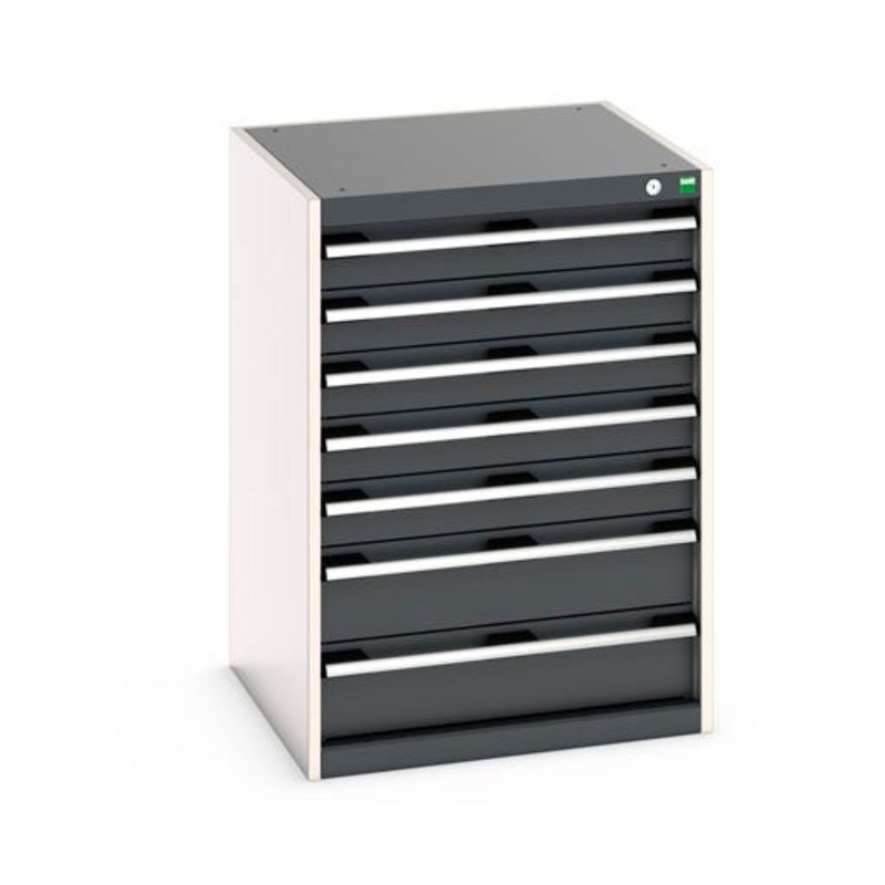 cubio drawer cabinet with 7 drawers. Featuring a heavy duty, reinforced steel housing with up to 1.5 tonne total capacity and 100% extension drawers. Drawer configuration: 5x 100mm, 2x 150mm (75kg U.D.L.). Finished in durable powder coat paint in RAL 7035 light grey / RAL 7016 anthracite grey. WxDxH: 650x650x900mm.