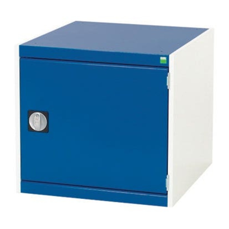 cubio shelf cupboard. Featuring a heavy duty, reinforced steel housing with up to 1.5 tonne total capacity with single, perfo panel lined, reinforced door with 1 adjustable height, galvanised steel shelf (100kg U.D.L.). Finished in durable powder coat paint in RAL 7035 light grey / RAL 5010 gentian blue. WxDxH: 650x750x600mm.
