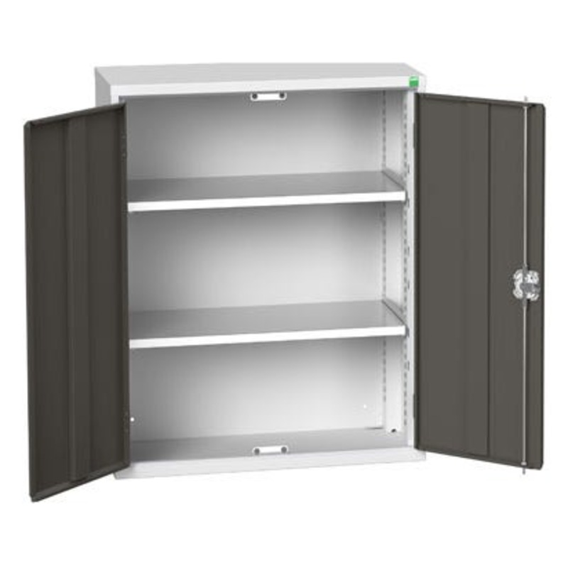 verso wall / shelf cupboard. Featuring a robust, fully welded steel housing with double, reinforced doors with 2 adjustable height, galvanised steel shelves (75kg U.D.L.). Finished in durable powder coat paint in RAL 7035 light grey / RAL 7016 anthracite grey. WxDxH: 800x350x900mm.