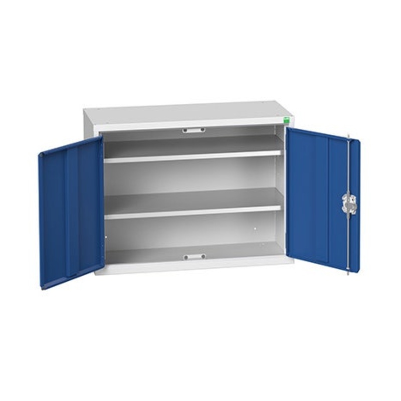 verso economy wall / shelf cupboard. Featuring a steel housing with double, reinforced doors with 2 adjustable height, galvanised steel shelves (35kg U.D.L.). Finished in durable powder coat paint in RAL 7035 light grey / RAL 5010 gentian blue. WxDxH: 800x
