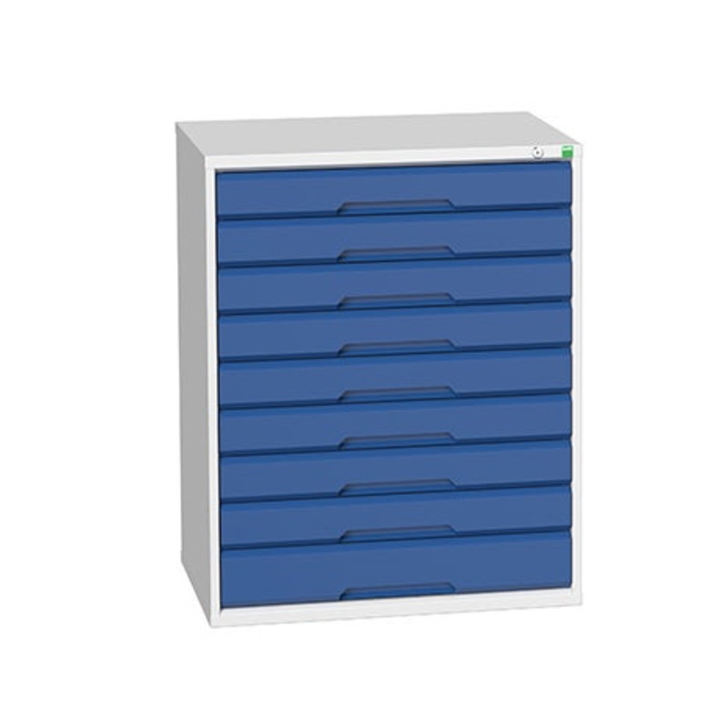 verso drawer cabinet with 9 drawers. Featuring a robust, fully welded steel housing with 100% extension drawers. Drawer configuration: 8x 100mm, 1x 125mm (75kg U.D.L.). Finished in durable powder coat paint in RAL 7035 light grey / RAL 5010 gentian blue. WxDxH: 800x550x1000mm.