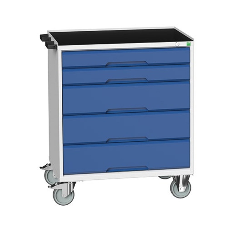 verso mobile drawer cabinet with 5 drawers & top tray with mat. Featuring a robust, fully welded steel housing with push – pull handle, 100% extension drawers with drawer blocking and 125mm diameter castors. Drawer configuration: 2x 100mm, 3x 175mm (50kg U.D.L.). Finished in durable powder coat paint in RAL 7035 light grey / RAL 5010 gentian blue. WxDxH: 800x550x965mm