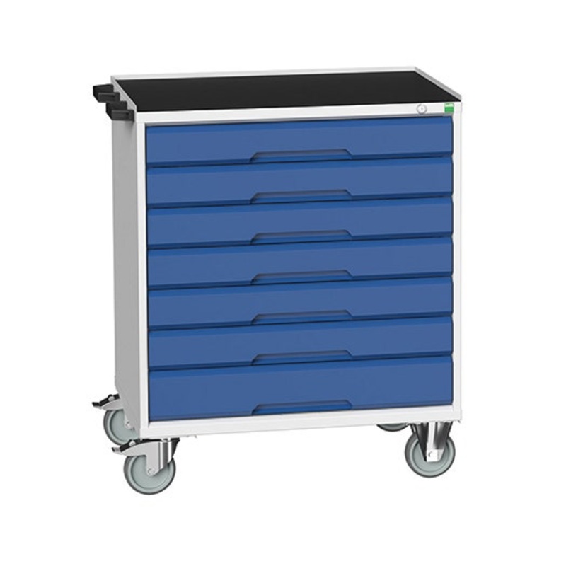 verso mobile drawer cabinet with 7 drawers & top tray with mat. Featuring a robust, fully welded steel housing with push – pull handle, 100% extension drawers with drawer blocking and 125mm diameter castors. Drawer configuration: 6x 100mm, 1x 125mm (50kg U.D.L.). Finished in durable powder coat paint in RAL 7035 light grey / RAL 5010 gentian blue. WxDxH: 800x550x965mm