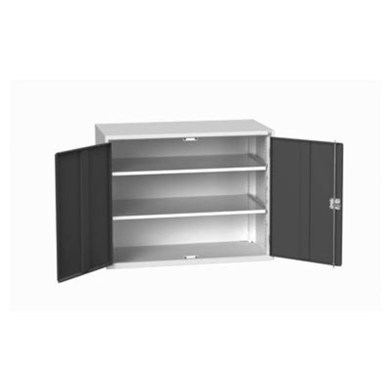 verso shelf cupboard. Featuring a robust, fully welded steel housing with double, reinforced doors with 2 adjustable height, galvanised steel shelves (75kg U.D.L.). Finished in durable powder coat paint in RAL 7035 light grey / RAL 7016 anthracite grey. WxDxH: 1300x550x900mm.