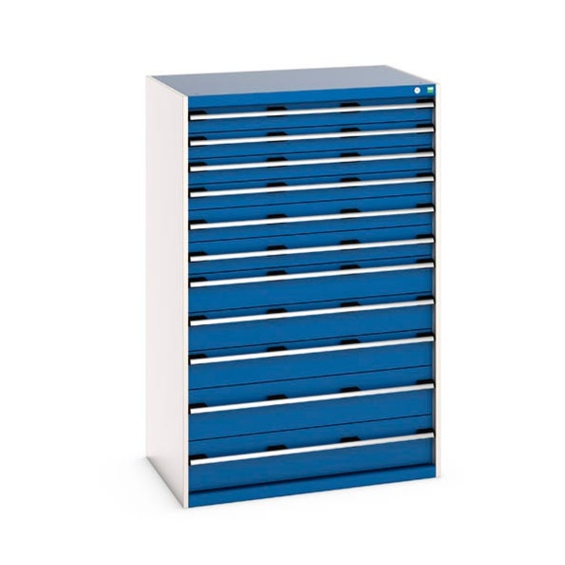 cubio drawer cabinet with 11 drawers. Featuring a heavy duty, reinforced steel housing with up to 1.5 tonne total capacity and 100% extension drawers. Drawer configuration: 4x 100mm, 2x 125mm, 3x 150mm, 2x 200mm (75kg U.D.L.). Finished in durable powder coat paint in RAL 7035 light grey / RAL 5010 gentian blue. WxDxH: 1050x750x1600mm.