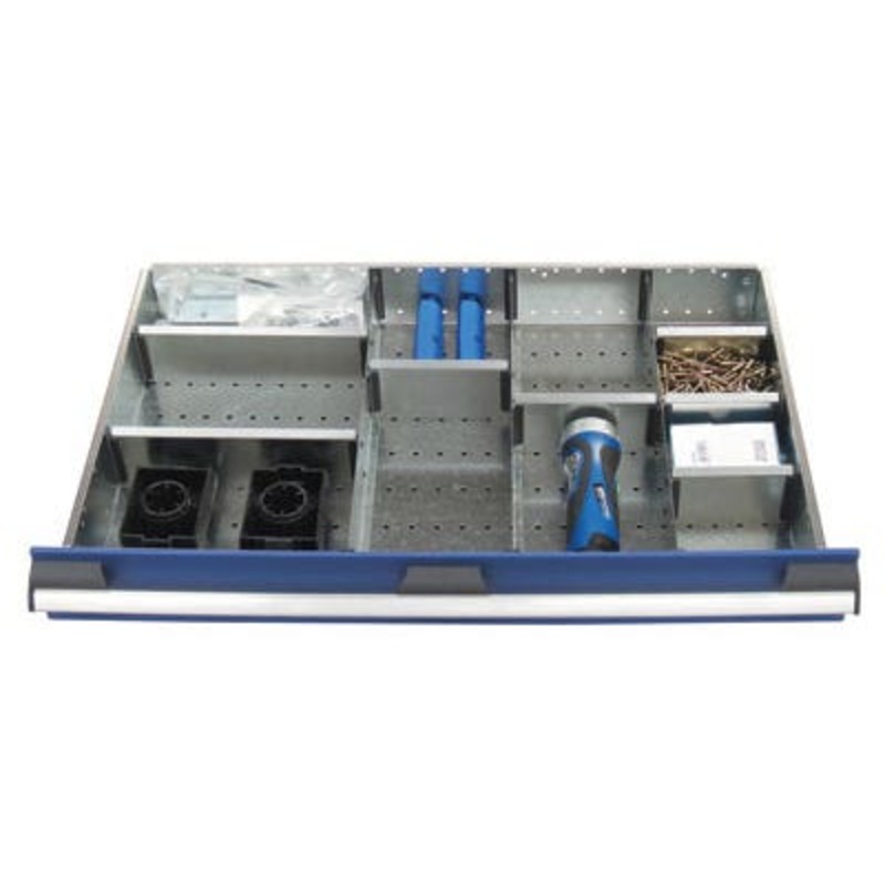 cubio adjustable metal divider kit 11 compartment. Manufactured in galvanised steel, featuring front to back main dividers and adjustable position sub dividers. For 150mm+ high drawers, (cabinet dimension WxD:800x525mm.)