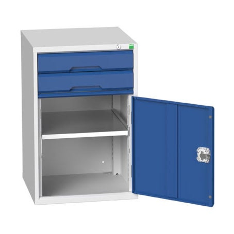 verso drawer-door cabinet with 2 drawers / cupboard. Featuring a robust, fully welded steel housing with 100% extension drawers. Drawer configuration: 2x 100mm (75kg U.D.L.). Cupboard section has single, reinforced, door and 1 galvanised steel shelf (75kg U.D.L.). Finished in durable powder coat paint in RAL 7035 light grey / RAL 5010 gentian blue. WxDxH: 525x550x800mm.
