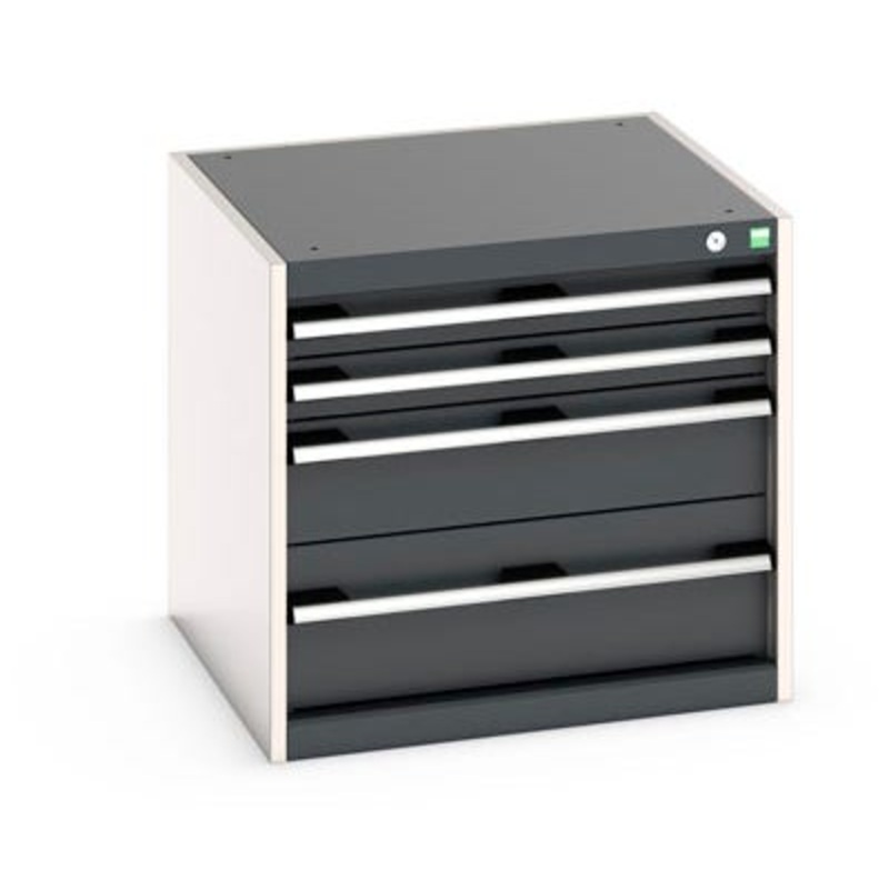cubio drawer cabinet with 4 drawers. Featuring a heavy duty, reinforced steel housing with up to 1.5 tonne total capacity and 100% extension drawers. Drawer configuration: 2x 75mm, 1x 150mm, 1x 200mm (75kg U.D.L.). Finished in durable powder coat paint in RAL 7035 light grey / RAL 7016 anthracite grey. WxDxH: 650x650x600mm.