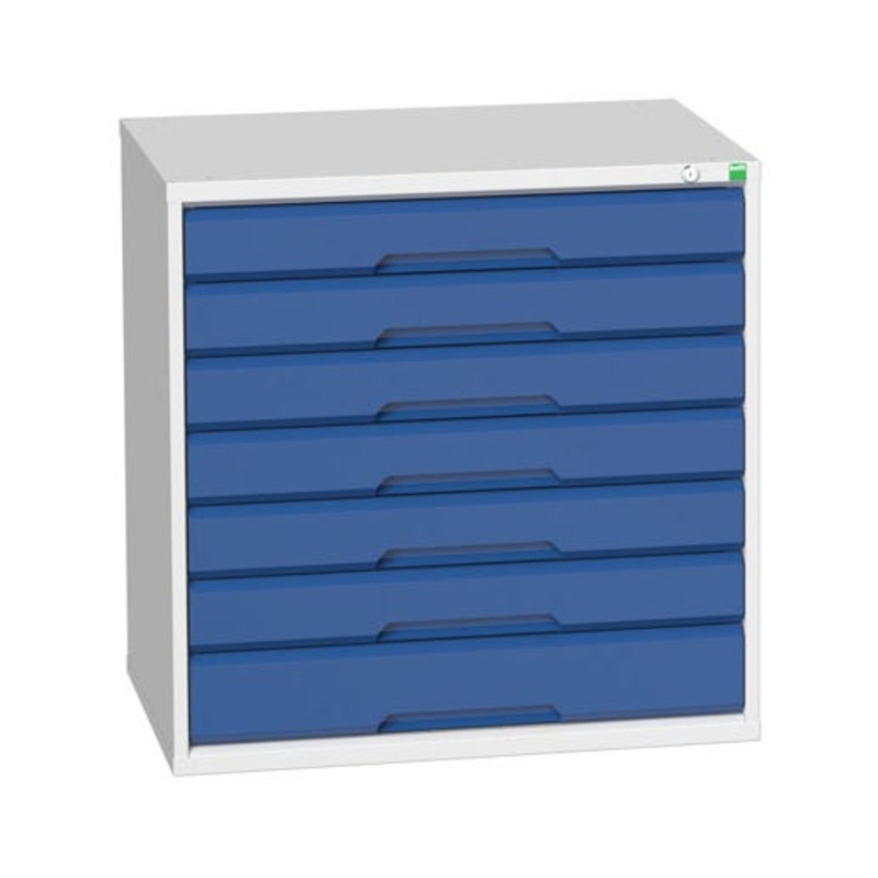 verso drawer cabinet with 7 drawers. Featuring a robust, fully welded steel housing with 100% extension drawers. Drawer configuration: 6x 100mm, 1x 125mm (75kg U.D.L.). Finished in durable powder coat paint in RAL 7035 light grey / RAL 5010 gentian blue. WxDxH: 800x550x800mm.