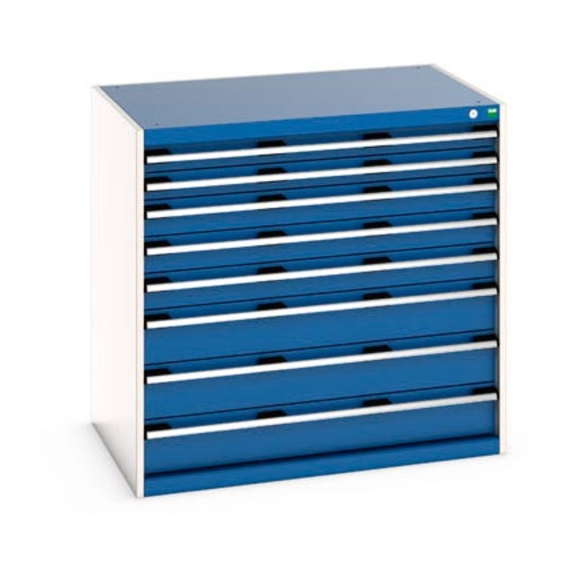 cubio drawer cabinet with 8 drawers. Featuring a heavy duty, reinforced steel housing with up to 1.5 tonne total capacity and 100% extension drawers. Drawer configuration: 2x 75mm, 3x 100mm, 3x 150mm (75kg U.D.L.). Finished in durable powder coat paint in RAL 7035 light grey / RAL 5010 gentian blue. WxDxH: 1050x750x1000mm.