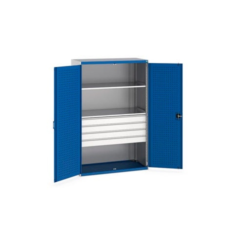 cubio kitted cupboard. Featuring a heavy duty, reinforced steel housing with up to 1.5 tonne total capacity with double, perfo panel lined, reinforced doors with 2 adjustable height, galvanised steel shelves (160kg U.D.L.), 4x 125mm drawers with 100% extension slides (75kg U.D.L.). Finished in durable powder coat paint in RAL 7035 light grey / RAL 5010 gentian blue. WxDxH: 1300x650x2000mm.