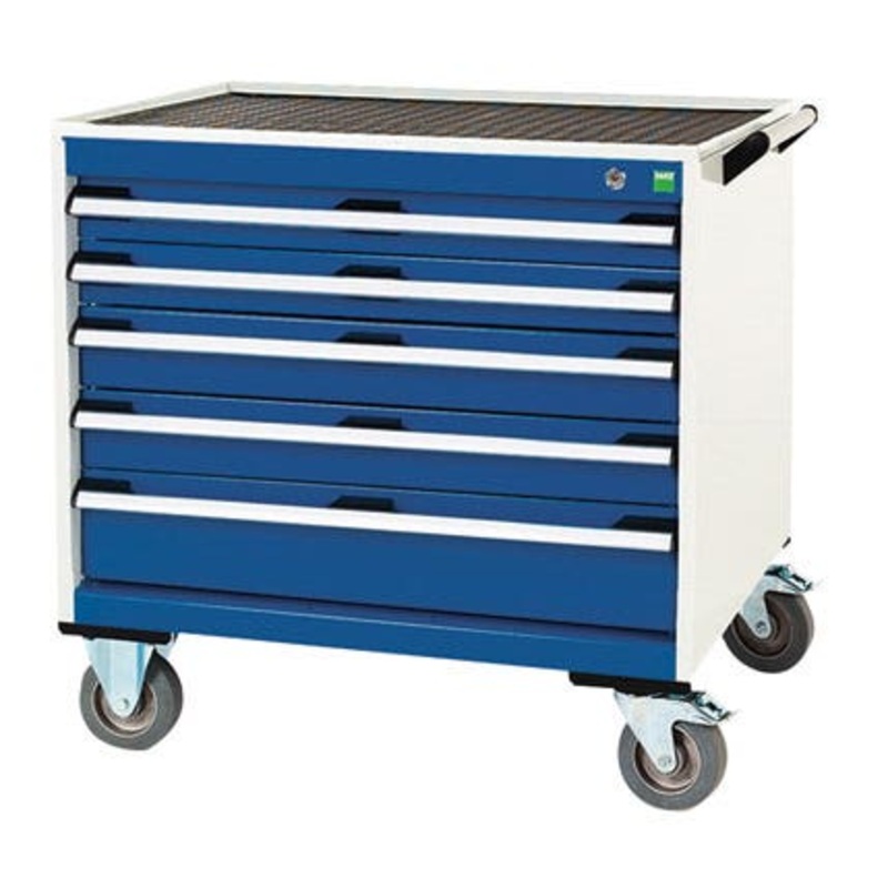 cubio mobile drawer cabinet with 5 drawers & top tray with mat. Featuring a heavy duty, reinforced steel housing with push – pull handle, 100% extension drawers with drawer blocking and 125mm diameter castors. Drawer configuration: 2x 75mm, 2x 100mm, 1x 150mm (50kg U.D.L.). Finished in durable powder coat paint in RAL 7035 light grey / RAL 5010 gentian blue. WxDxH: 800x650x785mm