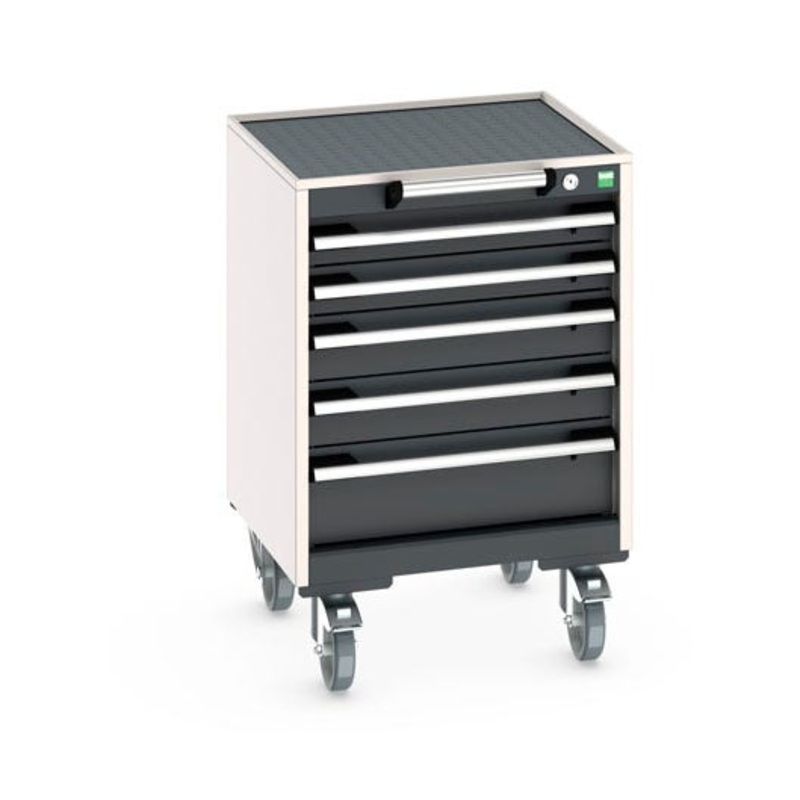 cubio mobile drawer cabinet with 5 drawers & top tray with mat. Featuring a heavy duty, reinforced steel housing with push – pull handle, 100% extension drawers with drawer blocking and 125mm diameter castors. Drawer configuration: 2x 75mm, 2x 100mm, 1x 150mm (50kg U.D.L.). Finished in durable powder coat paint in RAL 7035 light grey / RAL 7016 anthracite grey. WxDxH: 525x525x785mm