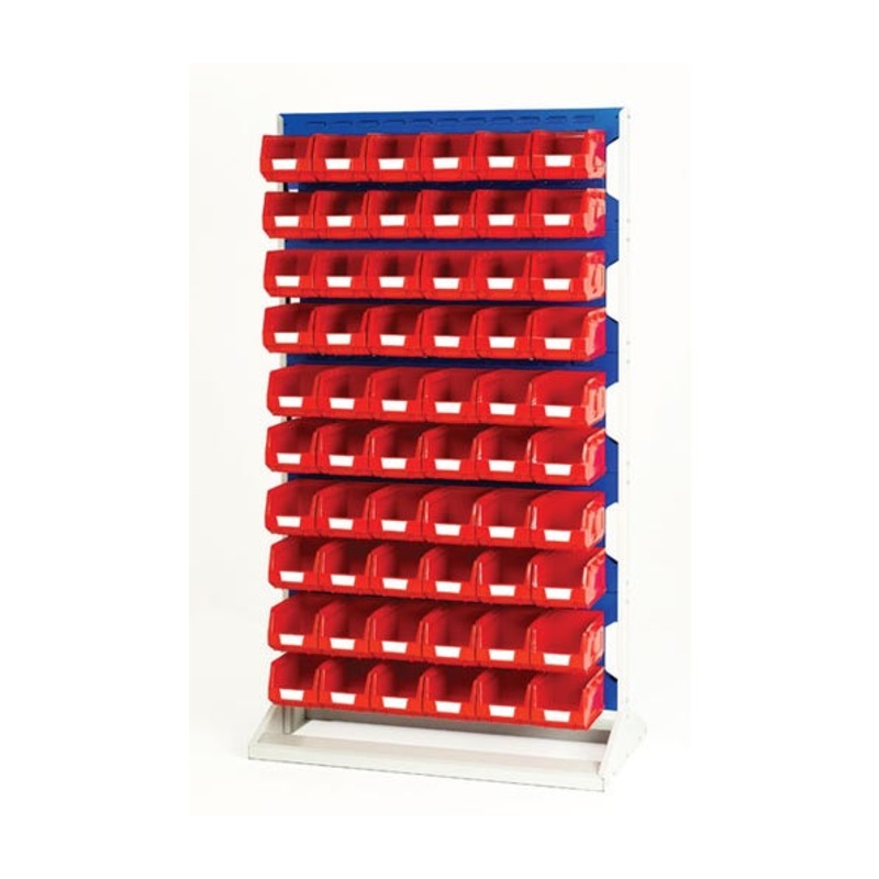 Louvre panel rack (double sided). Robust steel construction, with wide stable base and panels to both sides. Consists of 10 panels and 120x red bins. Finished in durable powder coat paint in RAL 7035 light grey / RAL 5010 gentian blue. WxDxH: 1000x550x1775mm