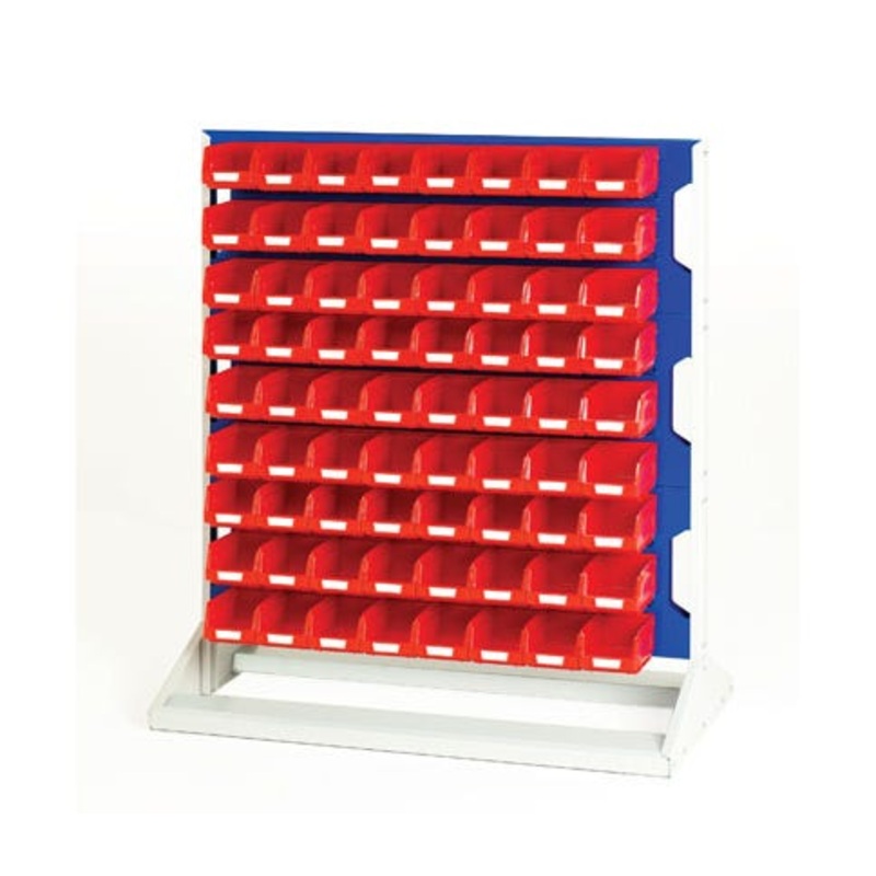Louvre panel rack (double sided). Robust steel construction, with wide stable base and panels to both sides. Consists of 6 panels and 144x red bins. Finished in durable powder coat paint in RAL 7035 light grey / RAL 5010 gentian blue. WxDxH: 1000x550x1125mm