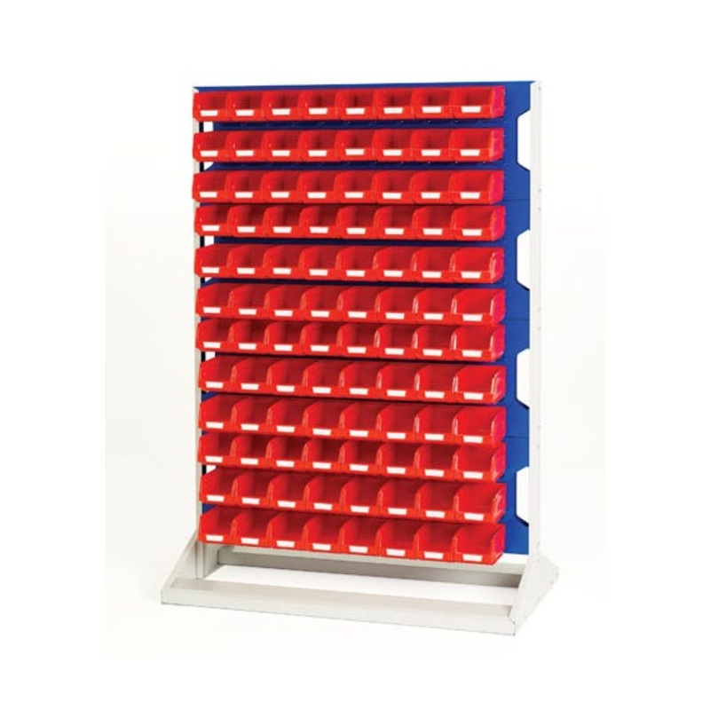 Louvre panel rack (single sided). Robust steel construction, with wide stable base and panels to both sides. Consist of 4 panels and 96x red bins. Finished in durable powder coat paint in RAL 7035 light grey / RAL 5010 gentian blue. WxDxH: 1000x550x1450mm