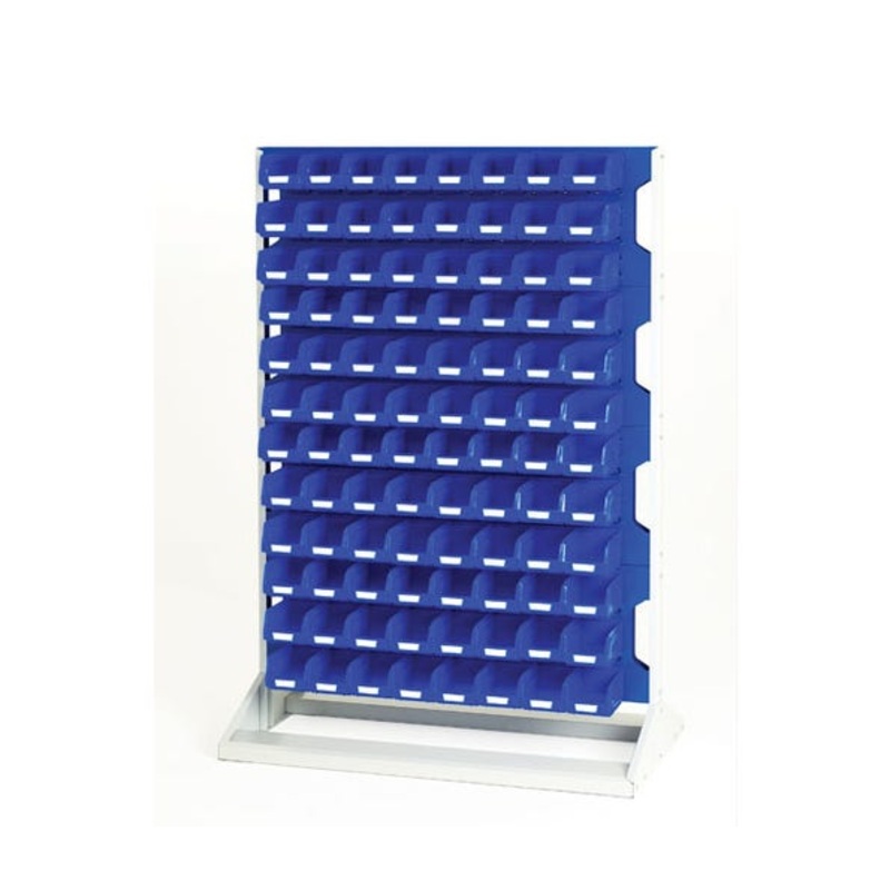Louvre panel rack (single sided). Robust steel construction, with wide stable base and panels to both sides. Consist of 4 panels and 96x blue bins. Finished in durable powder coat paint in RAL 7035 light grey / RAL 5010 gentian blue. WxDxH: 1000x550x1450mm