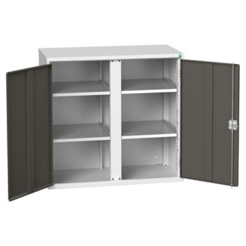 verso kitted cupboard with vertical partition. Featuring a robust, fully welded steel housing with a central vertical partition and double, reinforced doors with 4 adjustable height, galvanised steel shelves (75kg U.D.L.). Finished in durable powder coat paint in RAL 7035 light grey / RAL 7016 anthracite grey. WxDxH: 1050x550x1000mm.