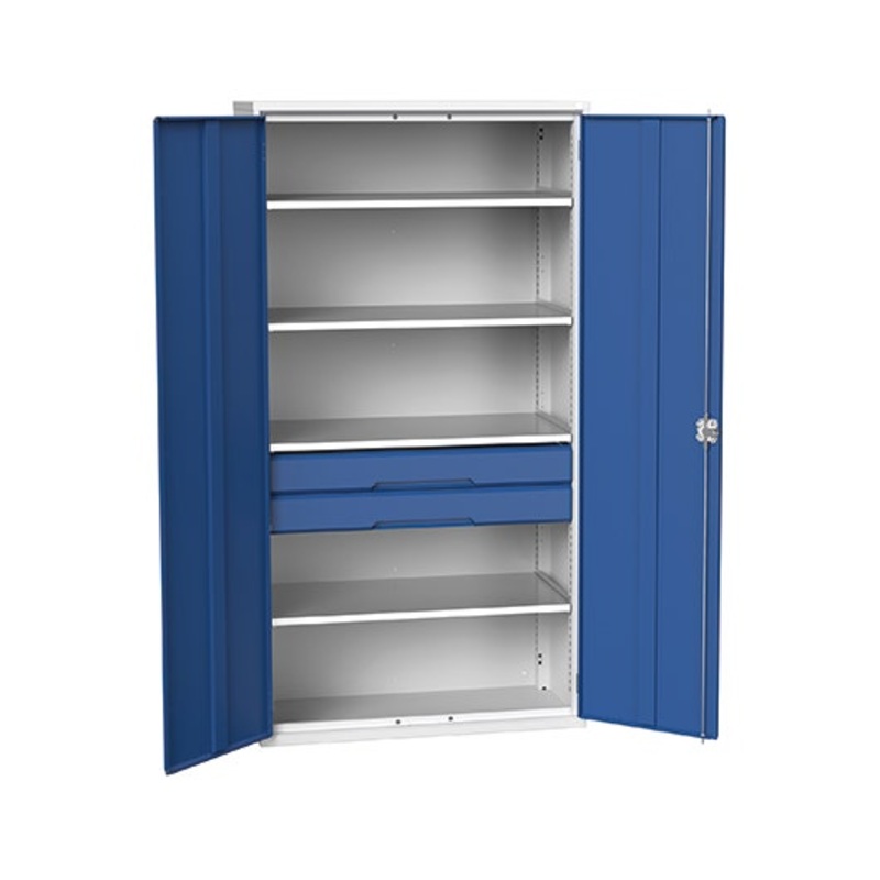 verso kitted cupboard. Featuring a robust, fully welded steel housing with double, reinforced doors with 4 adjustable height, galvanised steel shelves (75kg U.D.L.), 2x 125mm drawers with 100% extension slides (75kg U.D.L.). Finished in durable powder coat paint in RAL 7035 light grey / RAL 5010 gentian blue. WxDxH: 1050x550x2000mm.
