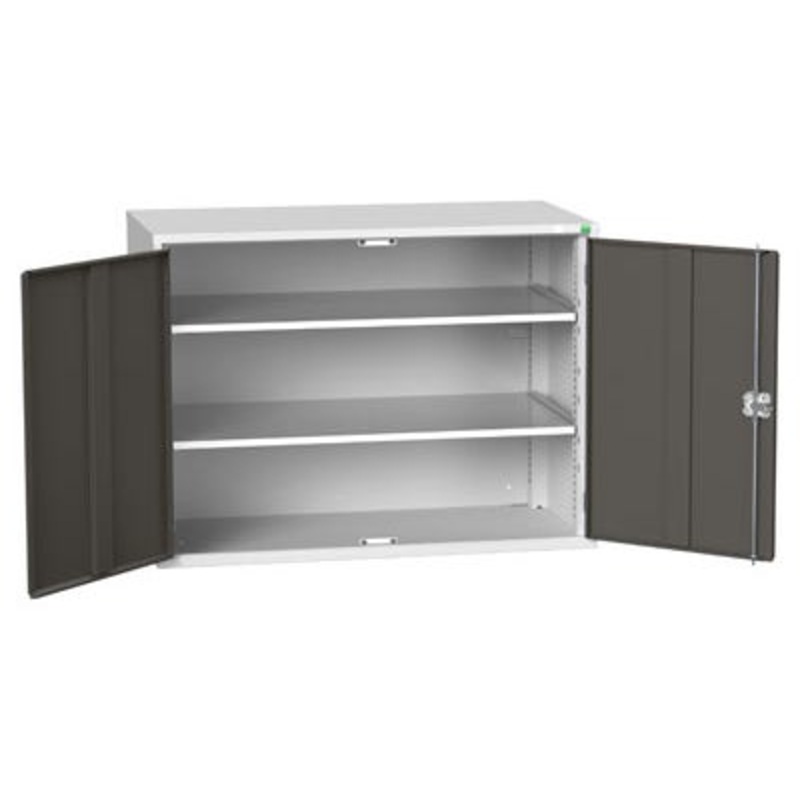 verso shelf cupboard. Featuring a robust, fully welded steel housing with double, reinforced doors with 2 adjustable height, galvanised steel shelves (75kg U.D.L.). Finished in durable powder coat paint in RAL 7035 light grey / RAL 7016 anthracite grey. WxDxH: 1300x550x1000mm.