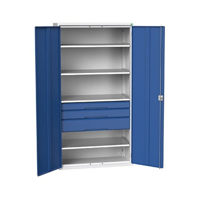 verso kitted cupboard. Featuring a robust, fully welded steel housing with double, reinforced doors with 4 adjustable height, galvanised steel shelves (75kg U.D.L.), 1x 100mm, 1x 125mm, 1x 175mm drawers with 100% extension slides (75kg U.D.L.). Finished in durable powder coat paint in RAL 7035 light grey / RAL 5010 gentian blue. WxDxH: 1050x550x2000mm.