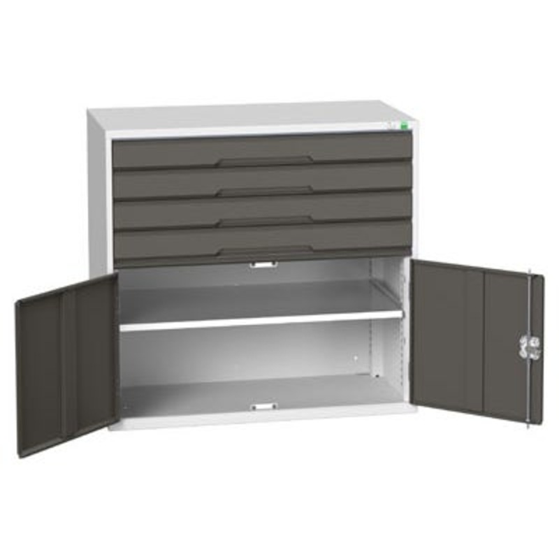 verso drawer-door cabinet with 4 drawers / cupboard. Featuring a robust, fully welded steel housing with 100% extension drawers. Drawer configuration: 4x 100mm (75kg U.D.L.). Cupboard section has double, reinforced, doors and 1 galvanised steel shelf (75kg U.D.L.). Finished in durable powder coat paint in RAL 7035 light grey / RAL 7016 anthracite grey. WxDxH: 1050x550x1000mm.