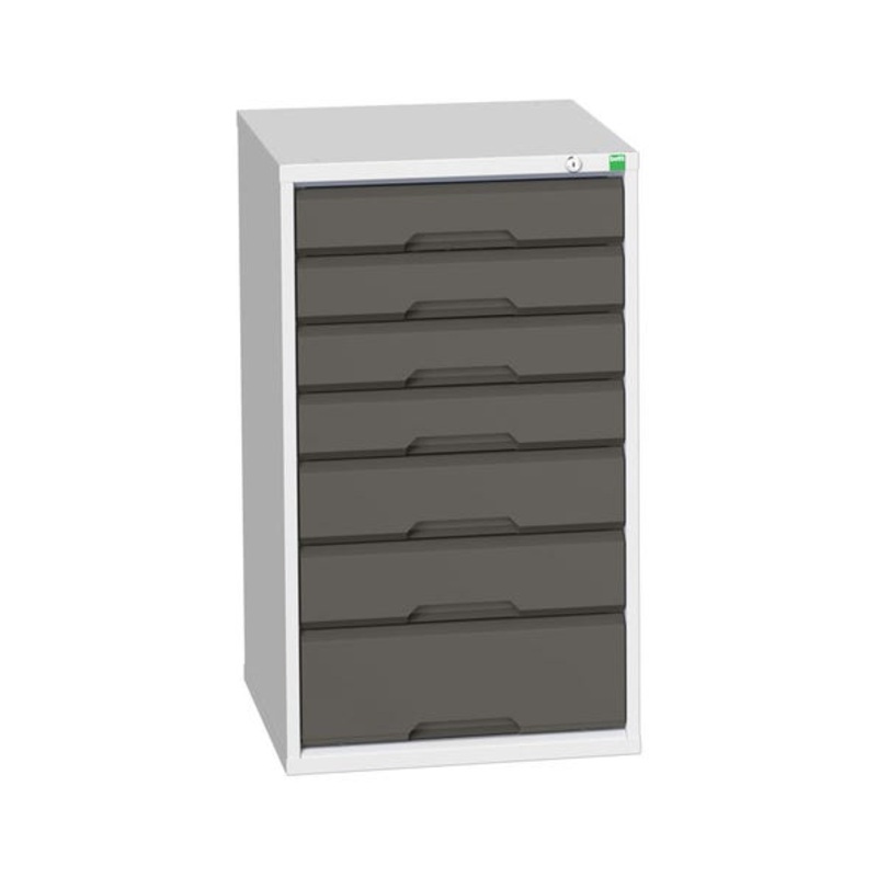 verso drawer cabinet with 7 drawers. Featuring a robust, fully welded steel housing with 100% extension drawers. Drawer configuration: 4x 100mm, 2x 125mm 1x 175mm (75kg U.D.L.). Finished in durable powder coat paint in RAL 7035 light grey / RAL 7016 anthracite grey. WxDxH: 525x550x900mm.