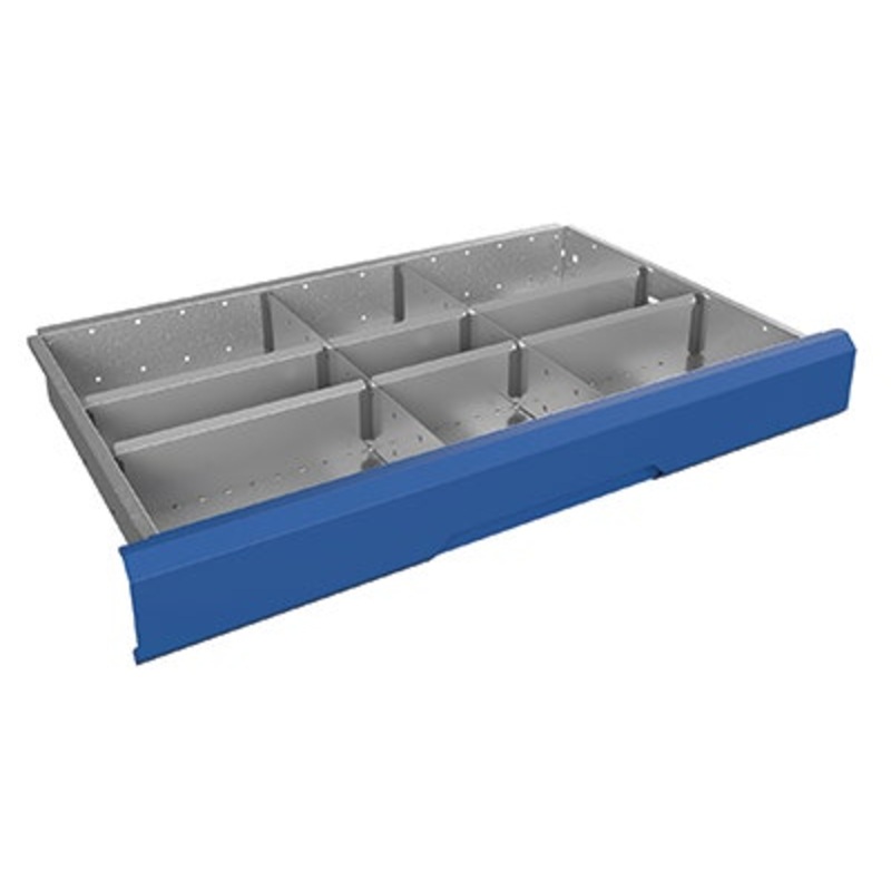 verso adjustable metal divider kit 9 compartment. Manufactured in galvanised steel, featuring front to back main dividers and adjustable position sub dividers. For 100/125mm high drawers, (cabinet dimension WxD:800x550mm.)