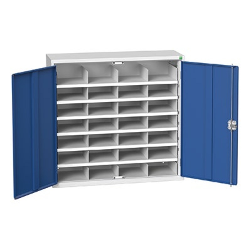 verso compartment cupboard. Featuring a robust, fully welded steel housing with double, reinforced doors with 6 adjustable height, galvanised steel shelves (75kg U.D.L.) 28 steel compartments each 235mm wide x 310mm deep x 100mm high. Finished in durable powder coat paint in RAL 7035 light grey / RAL 5010 gentian blue. WxDxH: 1050x350x1000mm.