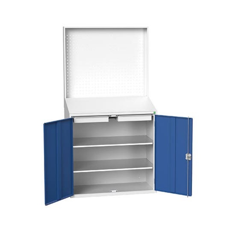 verso 1050 x 550 x 2000H Tool Station Supplied with verso Economy Cupboard with Lectern Top, 2 x drawers and 2x shelves Finished in light grey RAL 7035 and blue RAL 5010Also with 1050mm wide perfo back panel finished in light grey RAL 7035